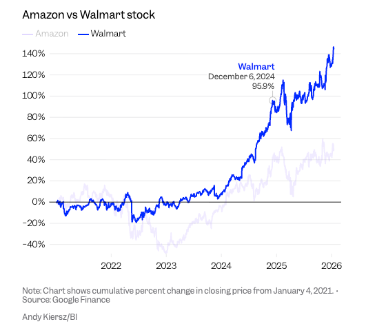 Walmart's market cap surpassed $1 trillion Tuesday, making it the first retailer to join an exclusive club dominated by tech giants. Shares climbed 1.6% to reach $126, capping a rally that has delivered 468% returns over the past decade versus 264% for the S&P 500. The milestone came during new CEO John Furner's first week after Doug McMillon stepped down following 12 years at the helm. McMillon transformed the brick-and-mortar chain into a digital powerhouse through billions in investments that initially compressed operating margins from 6% to just above 4%. Those bets paid off. Walmart now expects revenue topping $700 billion when it reports results this month, though Amazon will surpass that figure for the first time. The valuation gap tells a different story. Amazon sits at $2.6 trillion, more than double Walmart's worth. But Walmart's stock has outpaced Amazon 150% to 53% over five years as investors reward its logistics edge and AI integration. Delivery speed has become the central battleground. Amazon delivered 13 billion items same or next day globally in 2025, including 8 billion in the US. The company expanded coverage to 4,000 smaller cities and nearly doubled rural customers. But Walmart's 4,600 US stores let it offer same-day delivery to 93% of households. Amazon is playing catch-up in groceries, where it holds just 1.6% market share versus Walmart's 21%. Internal documents reveal Amazon is building Walmart-style "Supercenter" warehouses and a new distribution layer called 1DC to close the gap. The company is also installing micro-fulfillment centers in Whole Foods locations. The competitive dynamics favor different strengths. Amazon's online store sales hit $67 billion last quarter. Its AWS cloud business grew 20% and advertising jumped 24%. These high-margin segments make up a larger revenue share than Walmart's ads at under 1%. But Walmart trades at 42x forward earnings, near all-time highs, leaving some analysts questioning upside from here. P.S: Stay tuned for an announcement this week! |