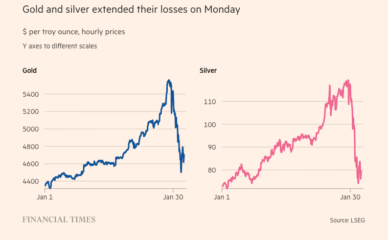 The metals meltdown accelerated Monday. Gold dropped as much as 9% before recovering to close down 4.5% at $4,672 per ounce. Silver tumbled 15% early in the session before paring losses to finish down 6.5% at $78.67. Both metals remain far below record highs of $5,500 for gold and $120 for silver reached last week. Friday's collapse was historic. Gold suffered its biggest one-day drop since 1983, plunging more than 9%. Silver's 31% crash marked its worst daily performance since 1980. The trigger was Trump's nomination of Kevin Warsh to lead the Federal Reserve. Warsh, viewed as hawkish on inflation, eased fears about central bank independence that had fueled the precious metals rally. The mechanics of the collapse reveal how safe haven assets morphed into momentum trades. Leveraged ETFs became increasingly popular during the parabolic rally. The ProShares Ultra Silver ETF, which offers 2x daily exposure, triggered massive selling during its rebalancing right as silver futures settled Friday afternoon. Heavy retail participation using borrowed money amplified the damage. CME Group raised margin requirements effective Monday. Gold futures margins jumped to 8% from 6%. Silver margins increased to 15% from 11%. This forced more selling as over-leveraged investors couldn't meet collateral demands. Bitcoin joined the carnage. The cryptocurrency dropped below $75,000 Sunday, its lowest level since April and down 40% from October's peak above $126,000. Nearly $590 million in bullish bets were liquidated in 24 hours. Spot Bitcoin ETFs saw $1.49 billion in outflows last week before reversing with $561.8 million in inflows Monday. Markets are divided on what comes next. JPMorgan lifted its year-end gold target to $6,300. Bernstein expects bitcoin to bottom around $60,000 before a reversal. But the deleveraging continues. South Korea's Kospi plunged 5.3% Monday as investors liquidated precious metals positions. |