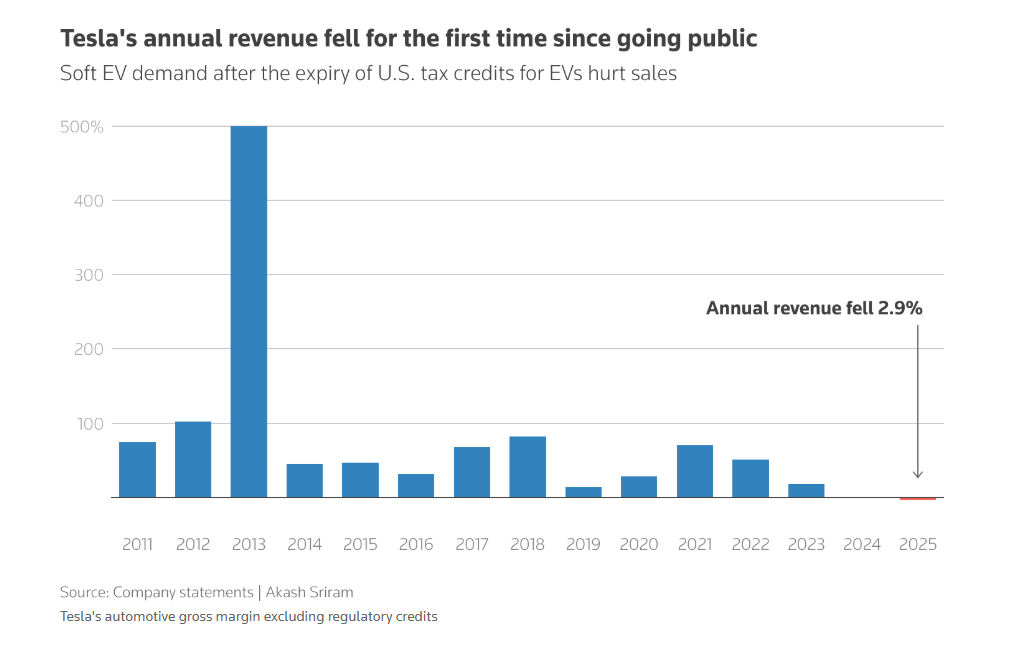 Tesla is killing off the Model S and Model X, the vehicles that made electric cars mainstream. The Fremont factory lines that once built these flagship sedans will now produce Optimus humanoid robots instead. Elon Musk calls it "an honorable discharge" for cars that helped Tesla become the world's most valuable automaker. The shift comes with a massive price tag. Tesla's capital expenditures will jump from $8.6 billion last year to over $20 billion in 2026, funding six production lines across robotics, autonomous vehicles, and AI infrastructure. Analysts wrote that Musk has reached a "burn the ships" inflection point, committing fully to a vision with no room for retreat. The timing is rather awkward. Tesla's revenue fell 3% in 2025, marking its first annual decline on record. Fourth quarter net income dropped 61% to $840 million. Automotive revenue, still 70% of the business, declined 10% as Tesla failed to launch new EV models while facing fierce competition from BYD in China and European rivals. To fund the transformation, Tesla invested $2 billion in Musk's AI startup xAI this week. The company is also evaluating potential AI collaborations with xAI, whose Grok chatbot already runs in Tesla vehicles. Meanwhile, SpaceX is reportedly in merger talks with both Tesla and xAI ahead of a planned IPO this year. Musk acknowledged that Optimus remains in early stages, with no significant production expected until late 2026. The Cybercab robotaxi faces similar delays. Musk admitted that Optimus isn't yet being used in Tesla factories "in a material way," despite plans to build a million units annually at the repurposed Fremont site. For investors, this is a bet on potential revenue from self-driving software and robotaxis before auto sales recover. As one longtime Tesla fan posted on social media: "Tesla has no interest in making cars anymore." |