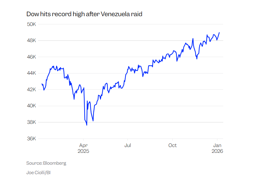 The Dow closed Monday at a record high, up 1.23%. The S&P 500 climbed 0.64%, the Nasdaq gained 0.69%. This came hours after US forces captured Venezuelan President Nicolás Maduro in a weekend raid that sent shockwaves through foreign policy circles. UBS reviewed the last 11 major geopolitical events and found the S&P 500 on average was just 0.3% lower one week after, and 7.7% higher 12 months later. "The old adage has long been to 'sell the rumor, buy the invasion,'" wrote Kent Fung at Fundstrat Research. The VIX tells the same story. Volatility currently stands at 14.5, well below stress levels and far from the 50+ spike seen during last year's tariff shocks. "That tells you markets are not paying up for protection despite elevated geopolitical headlines," said Billy Leung at Global X ETFs. Oil barely moved at first…Brent crude climbed just 1.1% to $61.46 a barrel. Venezuela produces roughly 1 million barrels per day, about 1% of global supply. The oil market remains in contango, not backwardation, meaning no supply panic. "The key here is whether the oil market supply tightens," said Leung. "As long as Brent trades around $60 and the forward curve remains in contango, the market is signalling ample supply and limited concern." Goldman Sachs and JPMorgan both hit record highs, rising more than 3%. The S&P 500 financials index jumped 2.2% as investors looked to upcoming quarterly reports. Gold provided the only significant safe-haven move, advancing over 2% to $4,419 per ounce. The dollar firmed slightly, up 0.2%, despite coming off its worst year since 2017. "While the headlines are unsettling, the market response so far has been notably restrained," said Jung In Yun at Fibonacci Asset Management. The movements reflect "modest hedging rather than flight-to-safety." Real yields remain elevated, credit spreads unchanged, and high yield spreads show no stress. "At this stage, the price action points to a temporary geopolitical risk premium rather than a structural shift," Jung added. Markets have seen this film before. They know how it ends. |