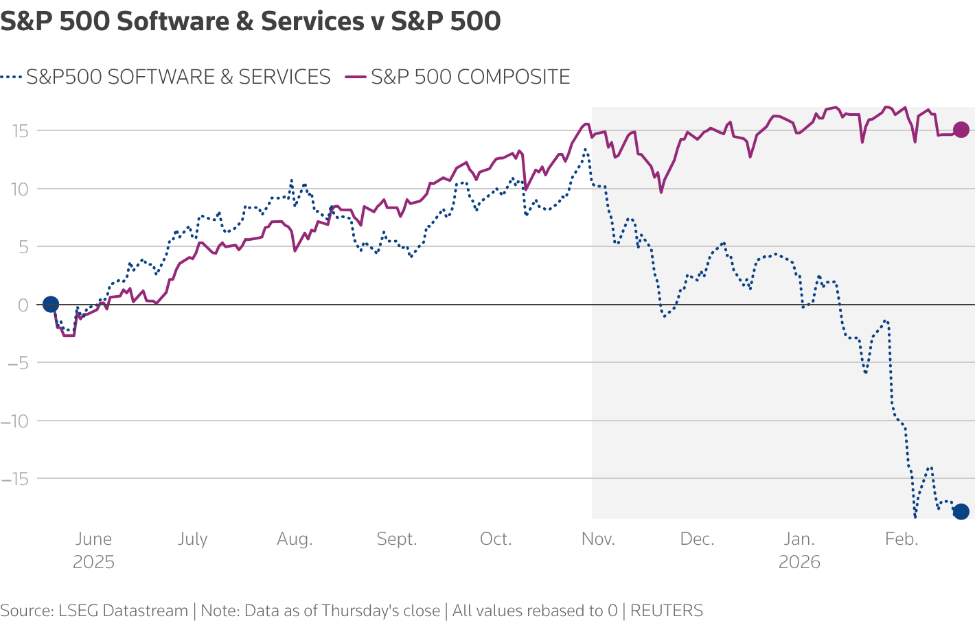The Dow fell 822 points on Monday, driven partly by a 7,000-word hypothetical published over the weekend. A viral report by Citrini Research imagined a 2028 where AI triggers mass white-collar unemployment, pushing the jobless rate to 10.2% and the S&P 500 down 38%. The post was framed as "a scenario, not a prediction," but it was received like a prophecy by the markets anyway. Perhaps, a self-fulfilling one… I say this because the selling that ensued was brutal and targeted. IBM tumbled 13%, its worst one-day decline since 2000. Software stocks Datadog, CrowdStrike, and Zscaler each dropped more than 9%. DoorDash fell 6.6% after Citrini called it the "poster child" for how AI would dismantle companies built on friction. American Express dropped 7.9%, Mastercard 6.3%, and Visa 4.3%. Private credit firms took hits too, with KKR down 9%, Apollo 5.2%, and Blackstone 6.1%. Every stock Citrini mentioned by name was down. The report's core argument centers on what author James van Geelen calls "ghost GDP:" output generated by AI that never circulates through the real economy because machines spend nothing on discretionary goods. The scenario envisions a negative feedback loop where companies cut workers to boost margins, displaced workers spend less, forcing more AI adoption to protect margins. Citrini argues that "friction was going to zero," eliminating businesses built on habitual intermediation. Economists pushed back. Robert Armstrong at the FT said the scenario felt "incoherent," questioning how GDP could rise while consumption collapses without explaining where investment or exports go. Ed Yardeni noted the market was "discounting a scenario in which AI is our Frankenstein monster." If you think I'm inflating impact, the panic was global. For instance, Indian IT stocks that were already under pressure plunged 4.7% to their lowest since August 2023. The NSE Nifty IT Index is on track for its worst month since 2003, wiping out more than $54 billion. Citrini's report specifically called out Tata Consultancy Services, Infosys, and Wipro, arguing their model depended on Indian developers costing a fraction of American counterparts while "the marginal cost of an AI coding agent had collapsed to, essentially, the cost of electricity." The S&P 500 Software & Services Index has fallen 24% year to date. Citrini's scenario may or may not unfold, but it's alarming to note that a single blog post can cause market upheaval of this magnitude. Why do you think this is? |