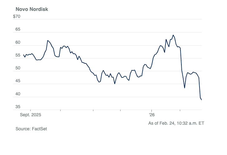 Novo Nordisk shares collapsed 16.5% Monday after its next-generation weight loss drug CagriSema failed to beat Eli Lilly's Zepbound in clinical trials. The stock hit its lowest level since June 2021, when Wegovy launched and triggered the boom that briefly made Novo Europe's most valuable company. CagriSema delivered 23% weight loss after 84 weeks compared to 25.5% for tirzepatide, Lilly's drug sold as Zepbound. The trial failed its primary goal of showing non-inferiority. Novo executives blamed the open-label design, meaning participants knew which drug they were taking, creating potential bias toward the well-known product.