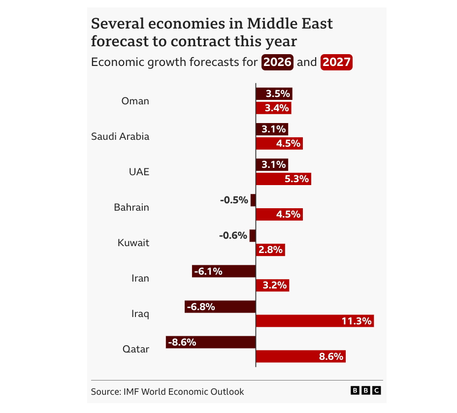 The International Monetary Fund cut its global growth forecast on Tuesday and warned that the world economy could slip into recession if the Iran war persists and oil prices remain elevated. In its World Economic Outlook, the fund presented three scenarios. Even the most optimistic one shows damage already done. Under the IMF's baseline assumption, which requires a short-lived conflict and energy markets normalizing by mid-year, global growth falls to 3.1% in 2026, down from 3.3% forecast in January. Absent the war, the IMF said it would have upgraded its forecast to 3.4%. The numbers get worse from there. An "adverse scenario" with oil prices averaging $100 per barrel this year would drag growth down to 2.5%. A "severe scenario" with prices hitting $110 this year and $125 in 2027 would cut growth to just 2.0%, a threshold the world has only crossed four times since 1980. The last two were the global financial crisis and the pandemic. The inflation picture is equally grim. Under the severe scenario, global inflation would top 6%, forcing central banks to raise interest rates even as growth weakens. IMF chief economist Pierre-Olivier Gourinchas warned that prolonged high oil prices could shift inflation expectations, requiring "more pain than in 2022" to bring prices back under control. The damage is not evenly distributed. The UK faces the sharpest downgrade in the G7, with growth slashed to 0.8% from a January forecast of 1.3%. The US forecast fell to 2.3%. China's outlook dropped to 4.4%. The Middle East takes the heaviest blow: Iran's economy is expected to contract 6.1%, Qatar 8.6%, and Iraq 6.8%. One country benefits. Russia's growth forecast was revised up to 1.1%, helped by higher oil prices and the temporary lifting of US sanctions on some Russian oil sales. Gourinchas put the stakes plainly: "The downside risks are tremendous." Even if the war ends quickly, the economic damage is locked in. And if it does not, the fund warned, the world faces an energy crisis "on an unprecedented scale." |