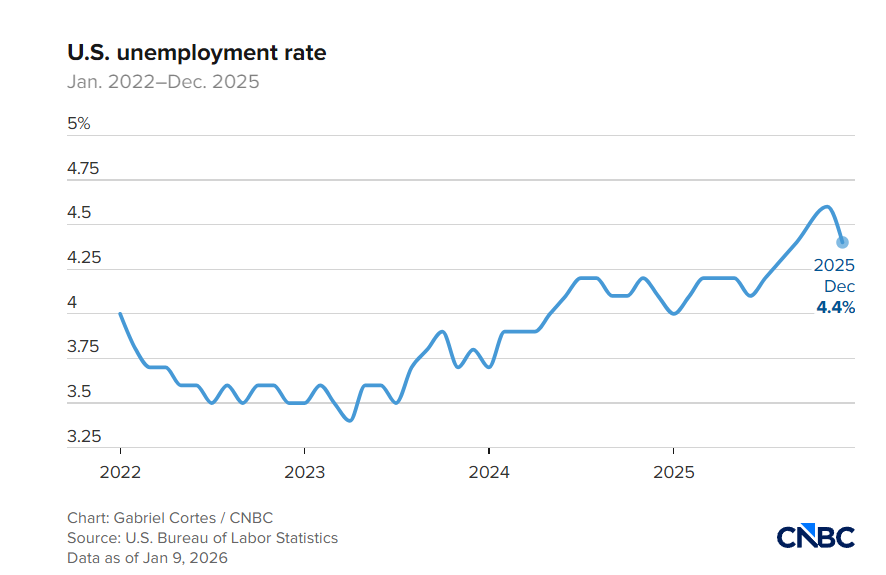 The US added 50,000 jobs in December, missing the 73,000 economists expected. Unemployment fell to 4.4% from 4.6%, which sounds good until you realize why. The economy added an average of 49,000 jobs per month in 2025, down from 168,000 per month in 2024. 2025 was the weakest year of employment growth outside of recession years since 2003. October and November were revised down by 76,000 jobs total. October's loss was revised to 173,000, worse than the initially reported 105,000. Healthcare added 21,100 jobs, and leisure and hospitality added 47,000. Retail trade lost 25,000 jobs, and construction shed 11,000. Same story all year. Healthcare and leisure/hospitality accounted for 84% of total job gains from January through November. For the remaining 78% of the economy, it's been a far different story. "Pretty much every other industry is in the throes of a 'hiring recession,'" said Heather Long at Navy Federal Credit Union. Wage growth held at 3.8% year-over-year, roughly in line with inflation. No real gains for workers.