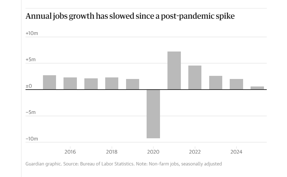 Source: The Guardian Nearly a million more people who wanted full-time jobs were working part-time involuntarily. Around 5.3 million people fell into this bucket, up from 4.4 million a year earlier. The Fed cut rates three times in 2025. The central bank slashed borrowing costs by 175 basis points total. Hiring didn't respond. Economists increasingly view the labor market's challenges as more structural than cyclical. "Lowering interest rates may help to buoy the economy at the margin, but it is unlikely to push companies that are on temporary hold to add workers," said Stephen Stanley at Santander. "The Fed is certainly powerless to counteract the concerns related to AI." Markets barely moved. Stocks ticked higher on rate cut optimism. Weak data means more cuts. We'll find out by the end of January. Job openings also fell to 7.15 million in November, the lowest level in more than a year. Down from 7.45 million in October. Job openings are at their lowest since September 2024. Hiring activity fell to an estimated 5.12 million new hires in November, down from 5.37 million in October. Hires are at their lowest since June 2024. The hiring rate slunk to 3.2%, matching its lowest rate in more than a decade, excluding the pandemic. There were 0.9 job opportunities per unemployed person in November, meaning fewer openings than unemployed workers. That's down from two openings per unemployed back in 2022. The quits rate tells the same story. Voluntary separations held at 2% in November, similar to what it's been for a year. "For workers who are fed up with their current roles, they aren't willing to give up job security because they aren't confident that they'll be able to find something on the open market," said Daniel Zhao at Glassdoor. Layoffs remained low. The layoff rate was 1.1% in November, below the historical average of 1.4%. Companies won't hire. They won't fire either. Economists attribute this to high uncertainty from trade and immigration policy, stubborn inflation, high interest rates, and AI investment replacing hiring. "We are still waiting to see a catalyst for the job market to open up again," Zhao said. "Employers are still in a wait-and-see mode. As interest rates come down and some of that uncertainty fades, there is an opportunity for businesses to hire more, but it's certainly not a guarantee." Many seem to think the low-hire, low-fire state isn't sustainable. Either the bottom falls out and leads to a recession, or uncertainty lifts and hiring picks up. The perceived probability of finding a job hit a record low of 43.1% in December, according to the New York Fed's Survey of Consumer Expectations. The survey has been running since 2013. This is the lowest reading ever. Expectations of losing a job rose to the highest mean probability since April 2025. The probability of voluntarily quitting dropped to the lowest rate since July 2023. Workers see no opportunities. They're terrified of losing what they have. They won't quit because they don't think they can find anything else. |